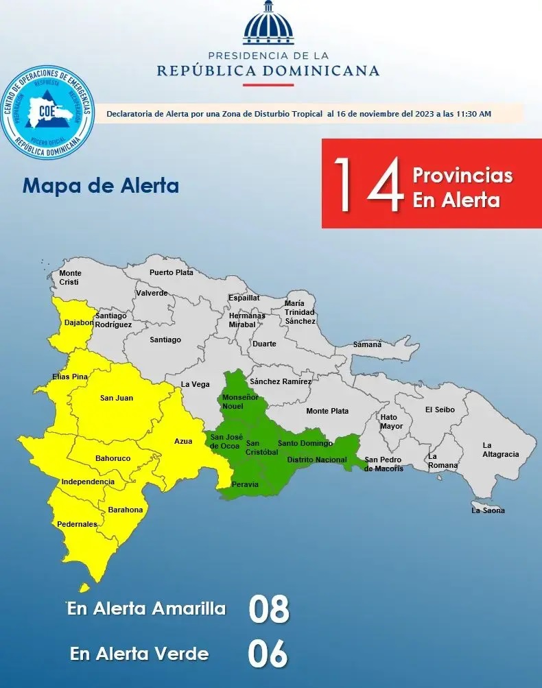 Ocho provincias están alerta amarillan : Pedernales, Barahona, ElĂas Piña, Independencia, San Juan, Azua, y DajabĂłn y Bahoruco. Mientras en que en verde están: Santo Domingo, Distrito Nacional, Peravia, San CristĂłbal, Monseñor Nouel y San JosĂ© de Ocoa.